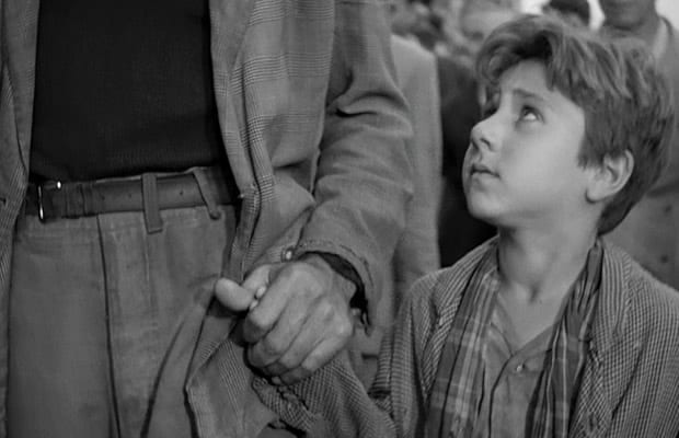 There are simple pleasures to be found within this sad setting – dewy streaks of morning light through the alleys as the men make their way to work, an absurd comedic subplot at the church, or various moments of father-son bonding as Antonio and Bruno ride into town together with the wind in their hair or they enjoy a plate of mozzarella sandwich and wine after spending the day scouring the city for the stolen bicycle. De Sica offers these glimpses of hope along the way.
